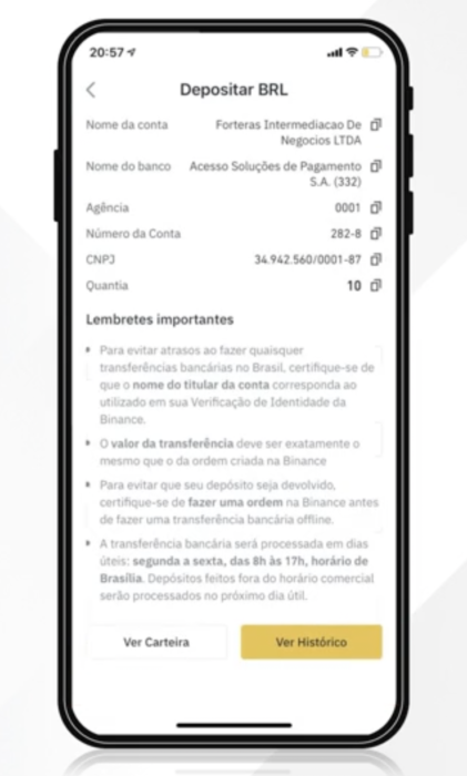O passo-a-passo para efetuar o depósito bancário é bem parecido com o Pix, então pode também seguir o tutorial abaixo já que o Pix é a forma mais imediata de obter o dinheiro na conta da Binance.